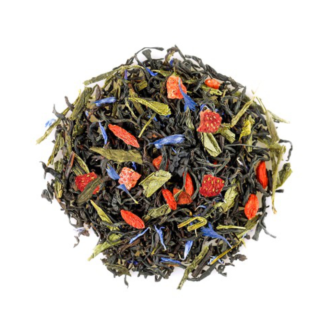 Champagne Splashes – Oryginalna mieszanka herbat na bazie czarnej herbaty cejlońskiej i zielonej herbaty chińskiej z plastrami truskawek, jagodami Goji, jasnoniebieskimi płatkami bławatka. Napar o czerwono-złotej barwie urzeka swoim owocowym aromatem. Podczas parzenia herbaty ujawniają się bogate odcieni smakowej kompozycji, które dają poczucie świętowania.