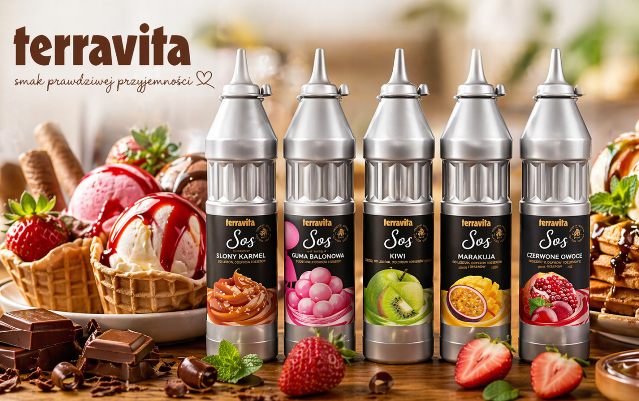 Sosy do lodów Terravita to wysokiej jakości dodatki deserowe, które wyróżniają się aksamitną konsystencją, intensywnym smakiem oraz atrakcyjną barwą. Idealnie sprawdzają się jako wykończenie lodów, gofrów, naleśników, ciast i innych słodkich deserów.